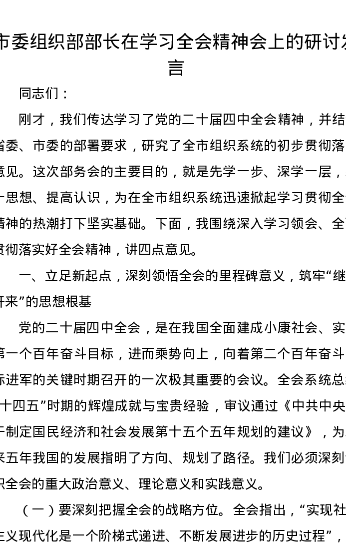 市委组织部部长在学习二十届四中全会精神会上的研讨发言