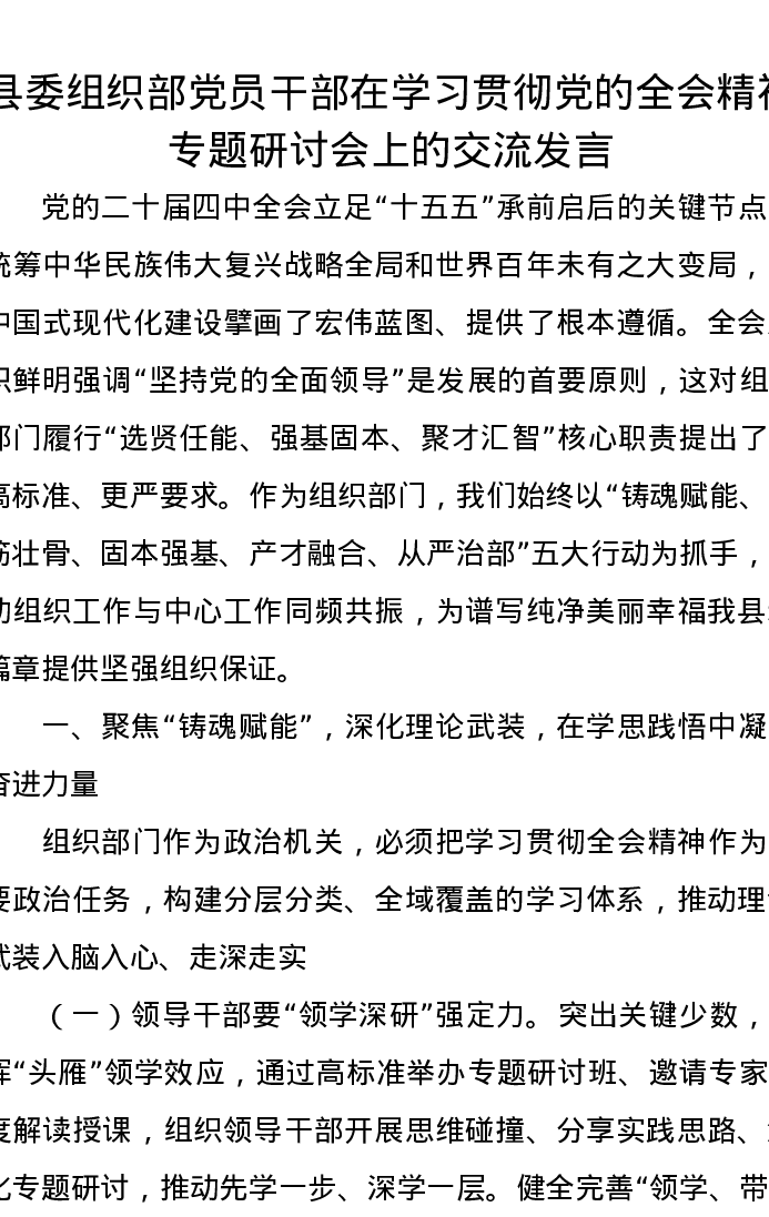 县委组织部党员干部在学习贯彻党的二十届四中全会精神专题研讨会上的交流发言