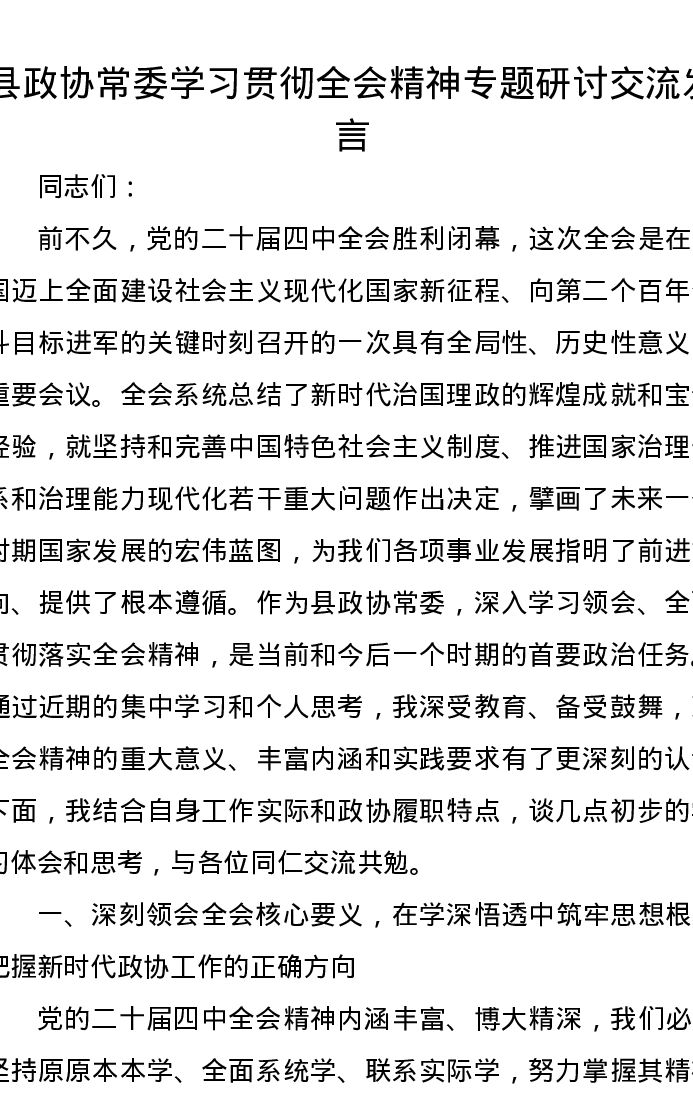 县政协常委学习贯彻二十届四中全会精神专题研讨交流发言