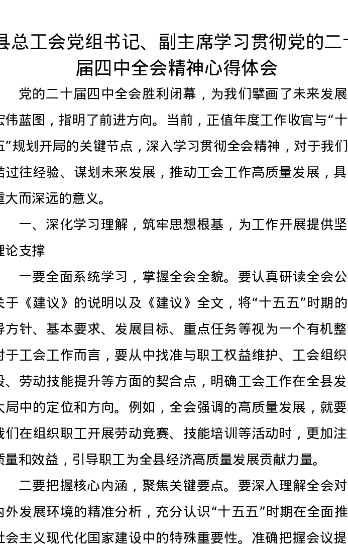 县总工会党组书记、副主席学习贯彻党的二十届四中全会精神心得体会