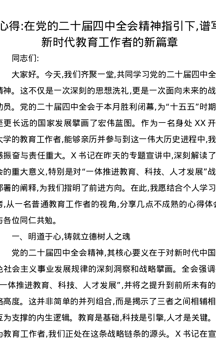 心得:在党的二十届四中全会精神指引下,谱写新时代教育工作者的新篇章