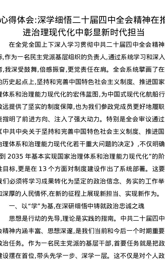心得体会:深学细悟二十届四中全会精神在推进治理现代化中彰显新时代担当