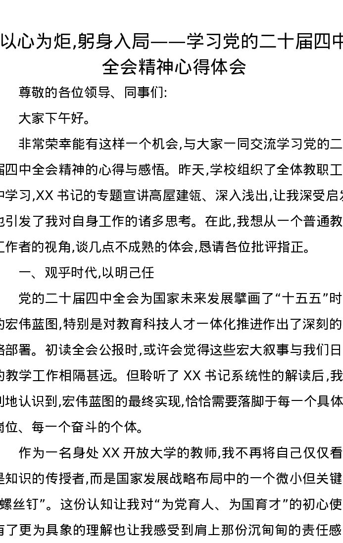 以心为炬,躬身入局——学习党的二十届四中全会精神心得体会
