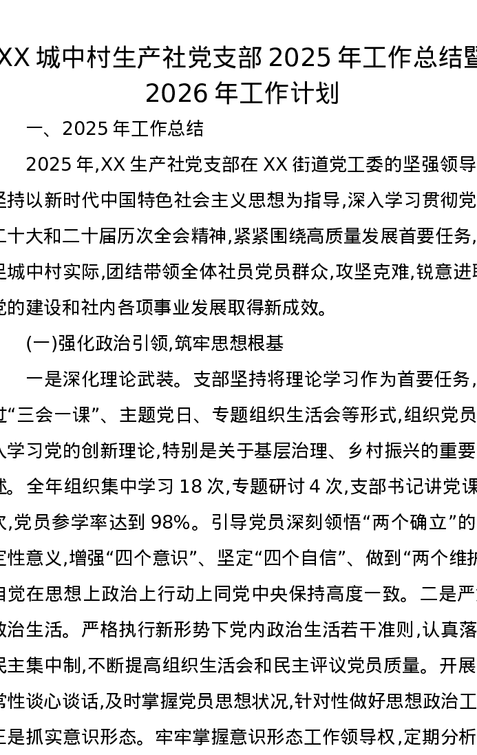 XX城中村生产社党支部2025年工作总结暨2026年工作计划