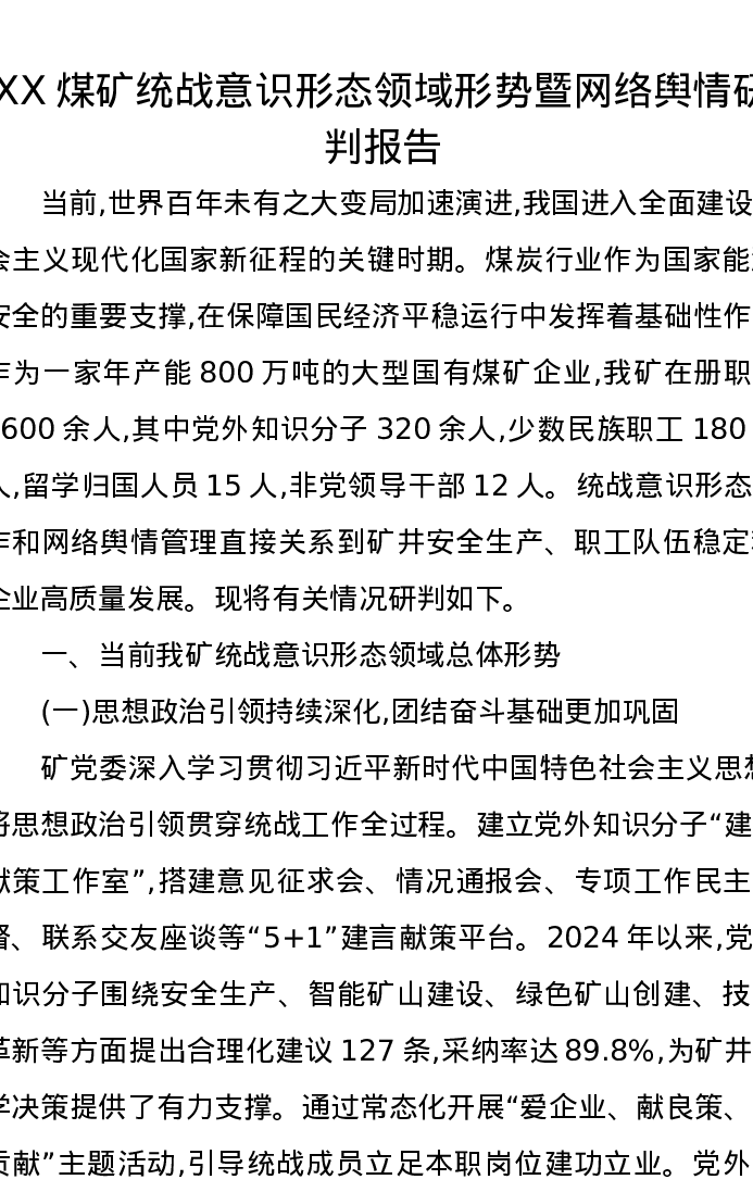 XX煤矿统战意识形态领域形势暨网络舆情研判报告