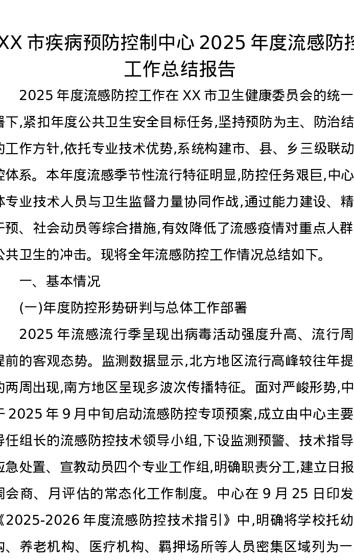 XX市疾病预防控制中心2025年度流感防控工作总结报告