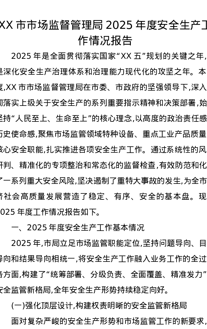 XX市市场监督管理局2025年度安全生产工作情况报告