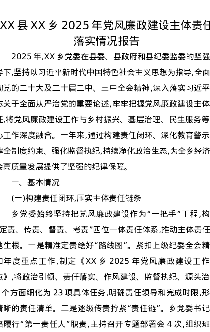 XX县XX乡2025年党风廉政建设主体责任落实情况报告