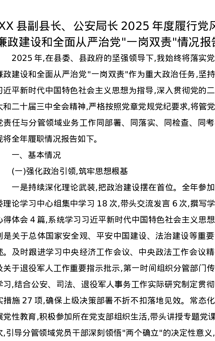 XX县副县长、公安局长2025年度履行党风廉政建设和全面从严治党一岗双责情况报告