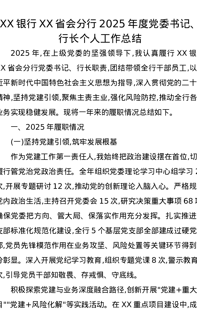 XX银行XX省会分行2025年度党委书记、行长个人工作总结