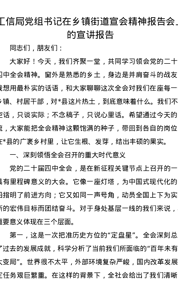工信局党组书记在乡镇街道宣会精神报告会上的宣讲报告