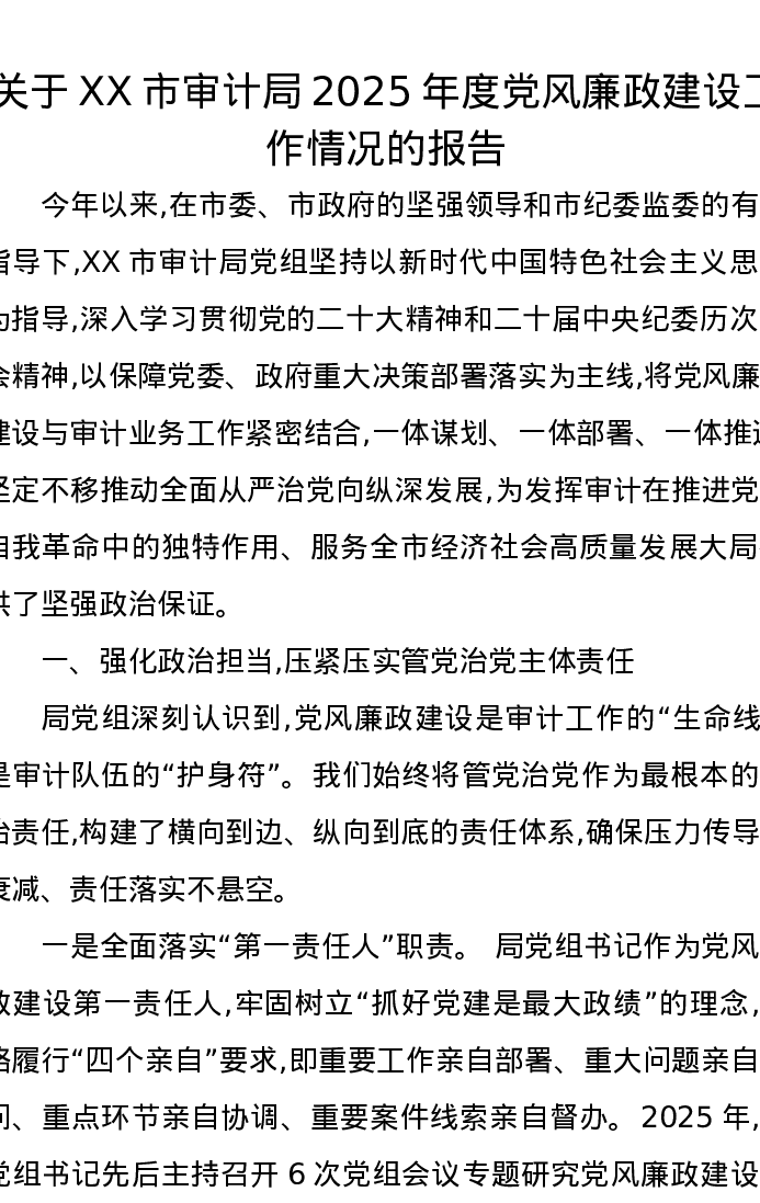 关于XX市审计局2025年度党风廉政建设工作情况的报告