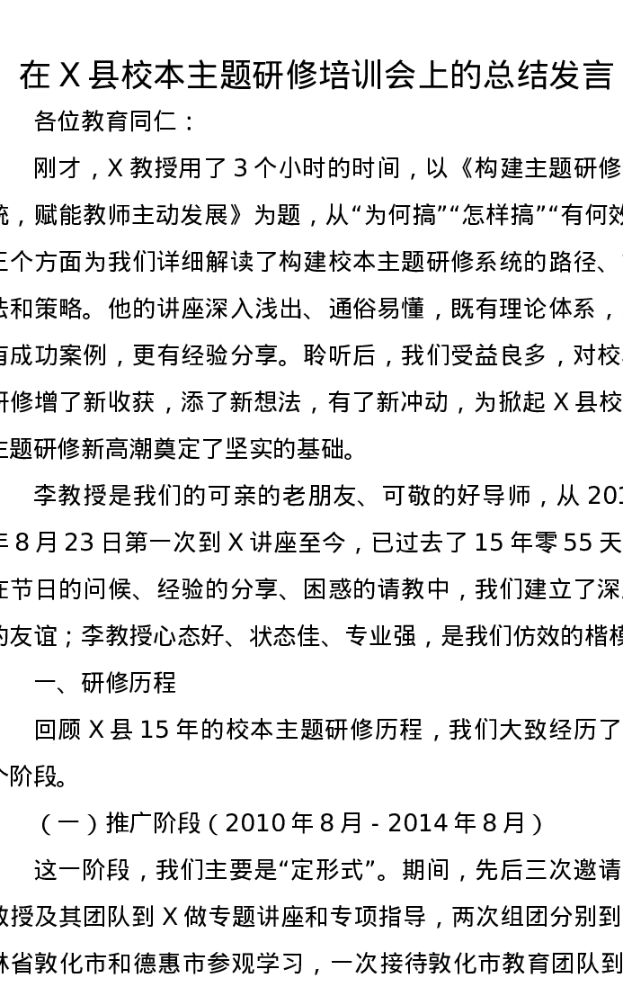 在X县校本主题研修培训会上的总结发言