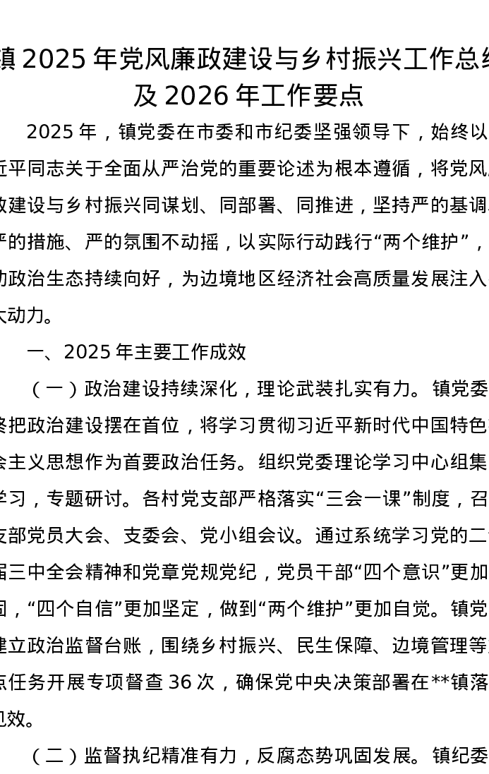 镇2025年党风廉政建设与乡村振兴工作总结及2026年工作要点