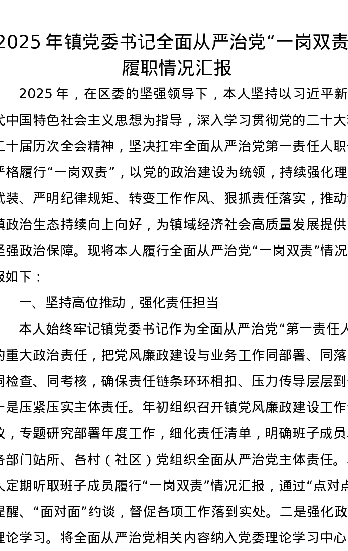 2025年镇党委书记全面从严治党“一岗双责”履职情况汇报