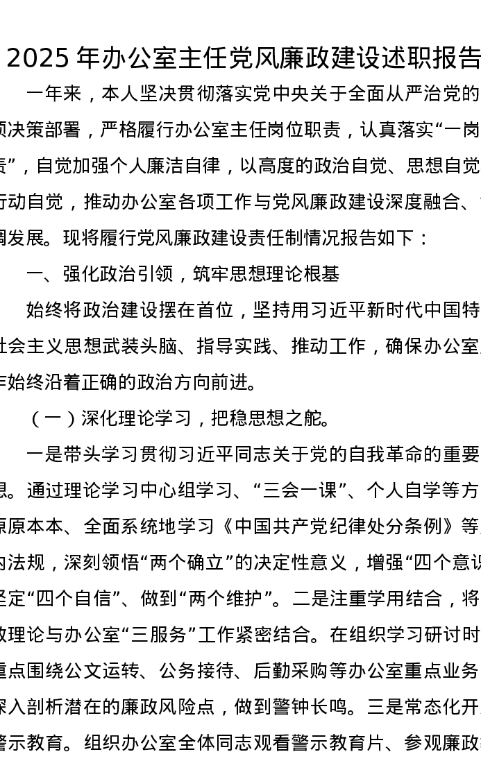 2025年办公室主任党风廉政建设述职报告