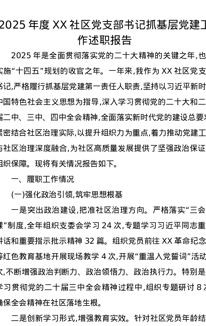 2025年度XX社区党支部书记抓基层党建工作述职报告