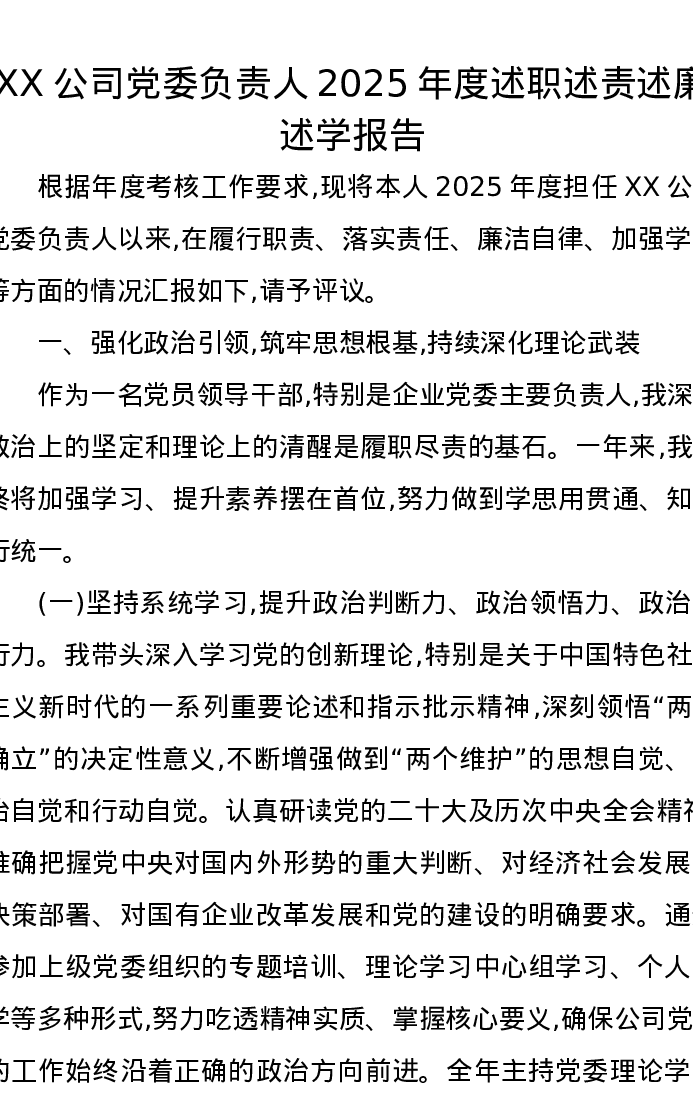 XX公司党委负责人2025年度述职述责述廉述学报告