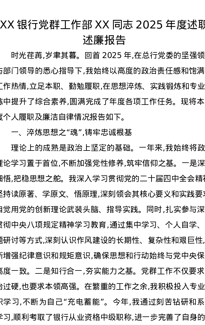 XX银行党群工作部XX同志2025年度述职述廉报告