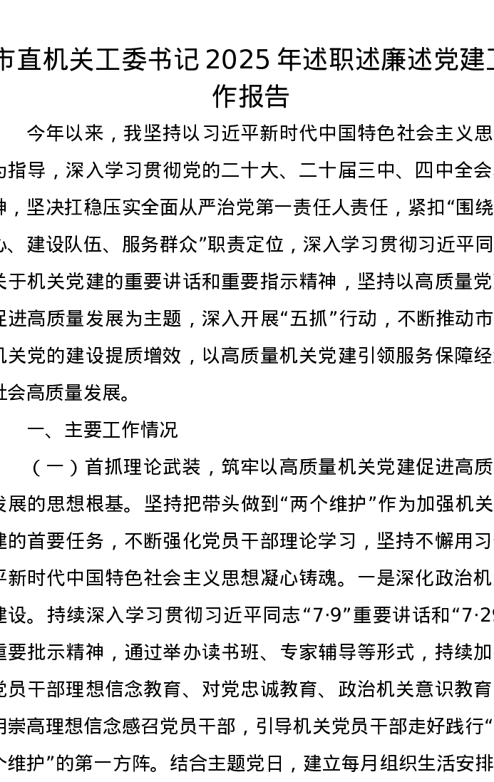 市直机关工委书记2025年述职述廉述党建工作报告