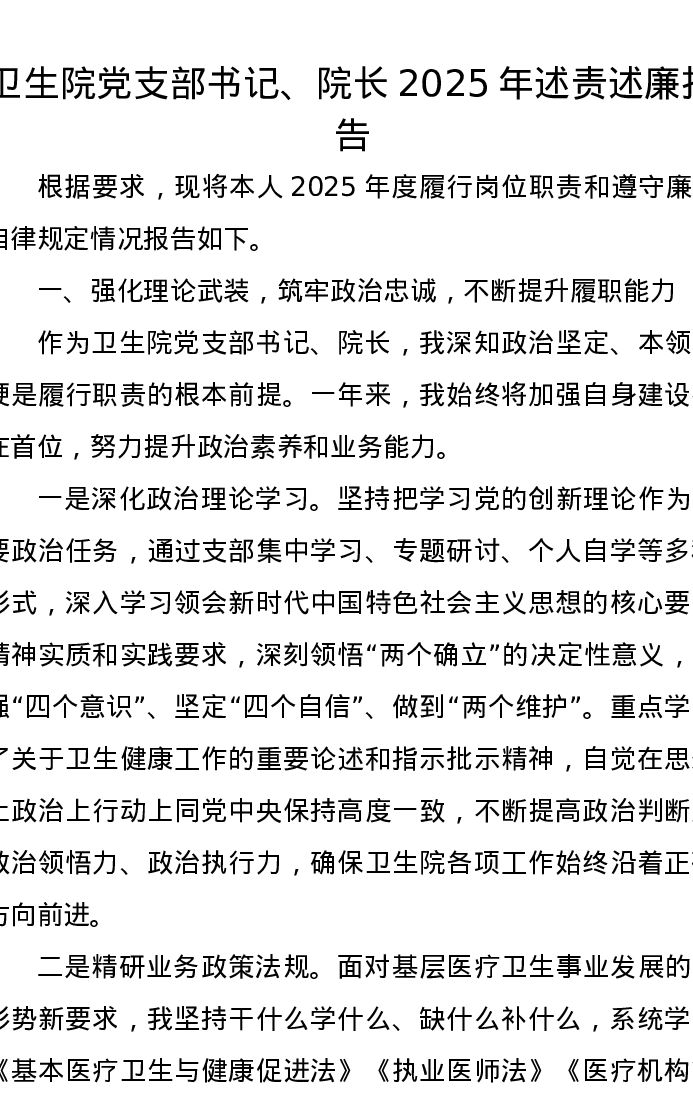 卫生院党支部书记、院长2025年述责述廉报告