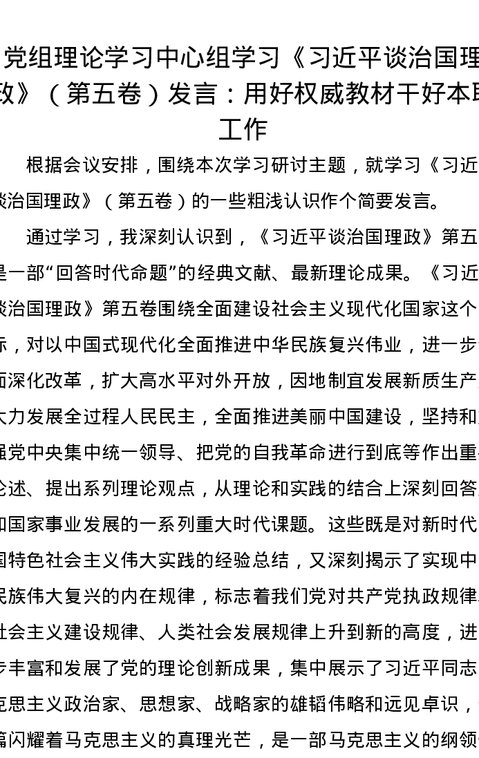 党组理论学习中心组学习《习近平谈治国理政》(第五卷)发言:用好权威教材干好本职工作