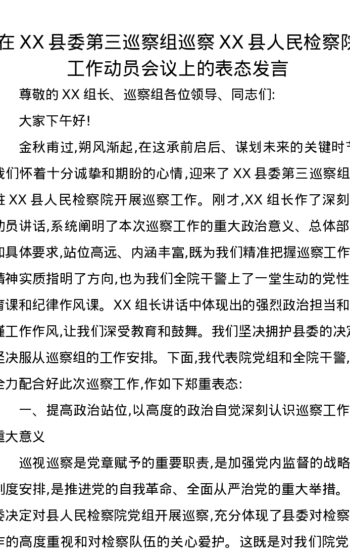 在XX县委第三巡察组巡察XX县人民检察院工作动员会议上的表态发言