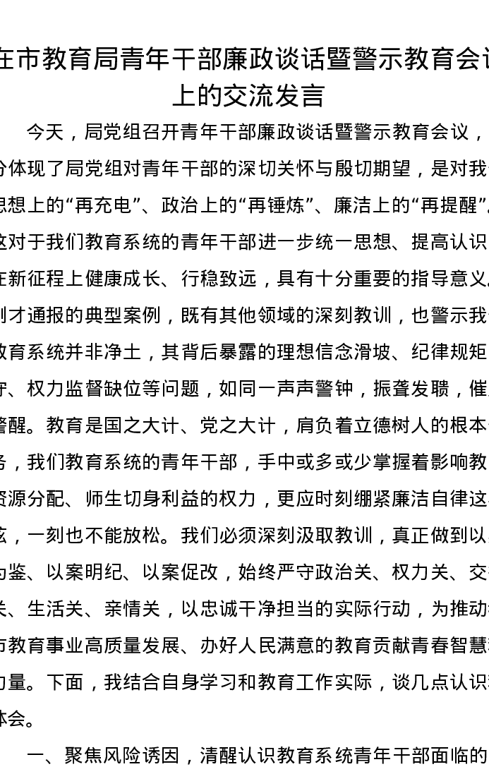 在市教育局青年干部廉政谈话暨警示教育会议上的交流发言