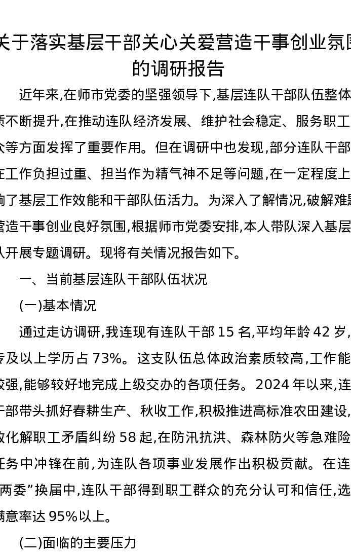 关于落实基层干部关心关爱营造干事创业氛围的调研报告
