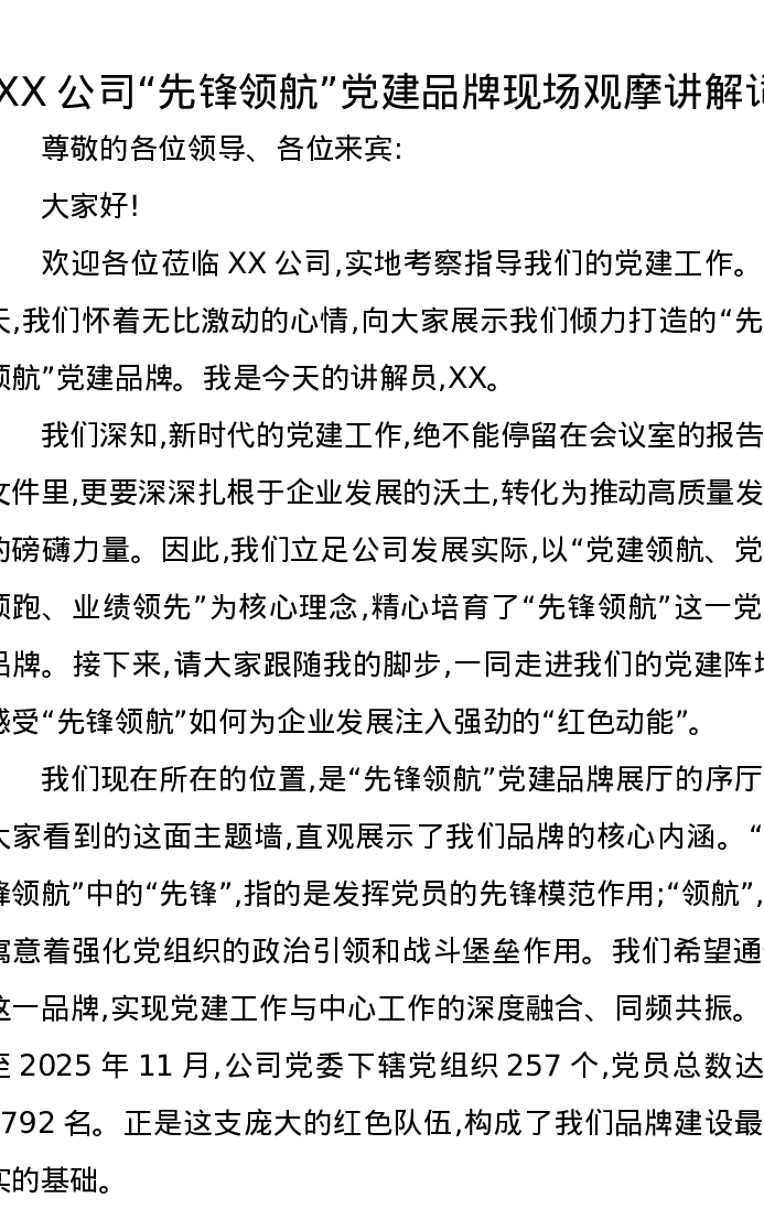 XX公司“先锋领航”党建品牌现场观摩讲解词