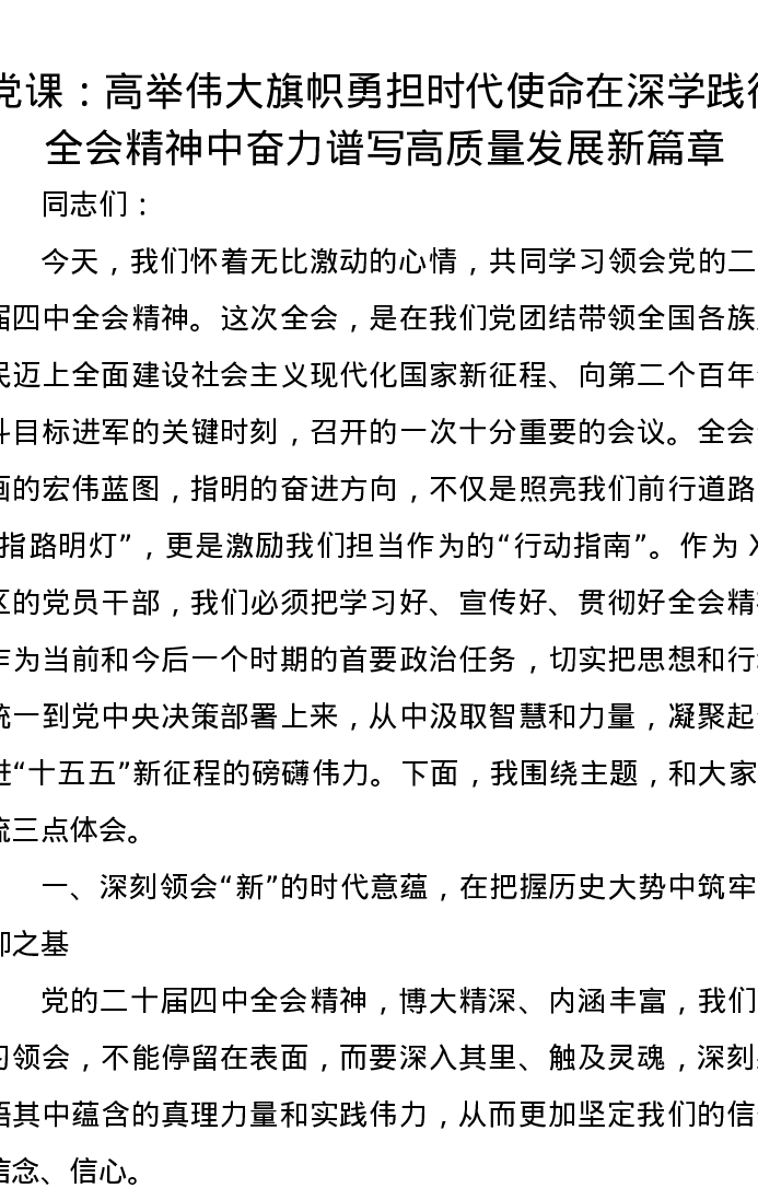 党课讲稿:高举伟大旗帜 勇担时代使命 在深学践行二十届四中全会精神中奋力谱写高质量发展新篇章
