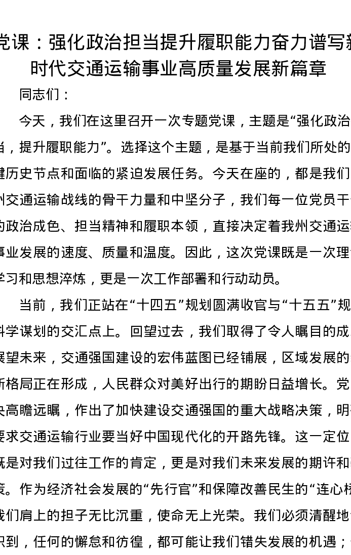 党课讲稿:强化政治担当 提升履职能力 奋力谱写新时代交通运输事业高质量发展新篇章