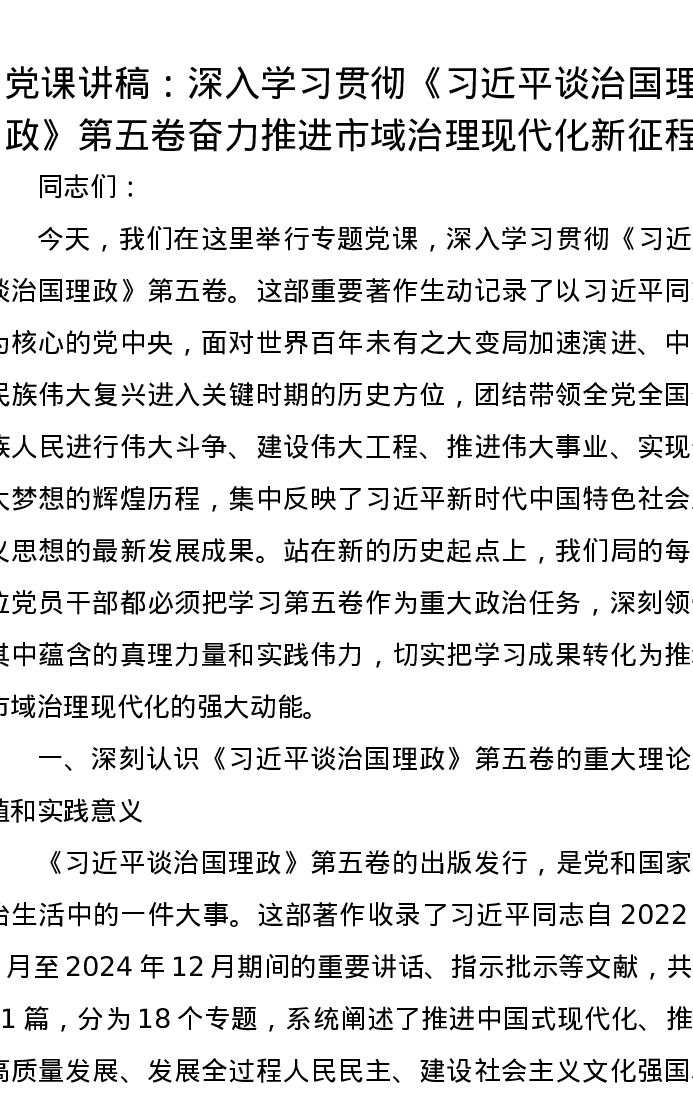 党课讲稿:深入学习贯彻《习近平谈治国理政》第五卷 奋力推进市域治理现代化新征程
