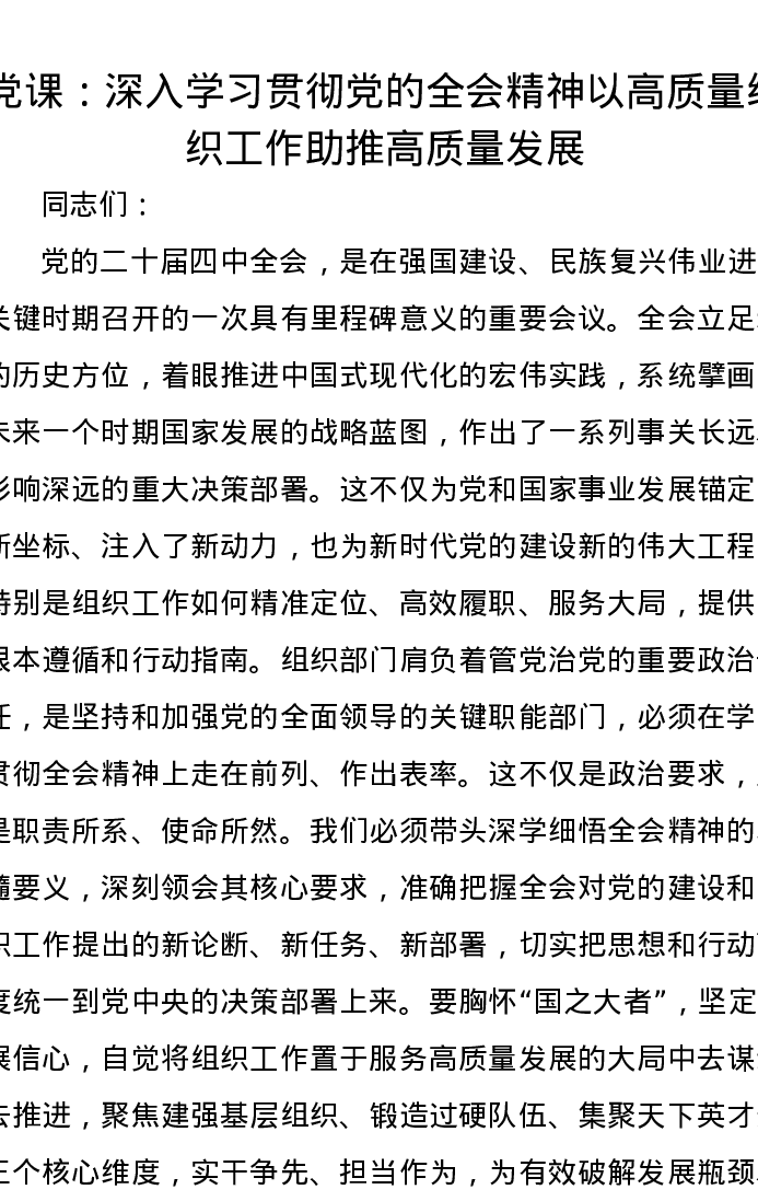 党课讲稿:深入学习贯彻党的二十届四中全会精神 以高质量组织工作助推高质量发展