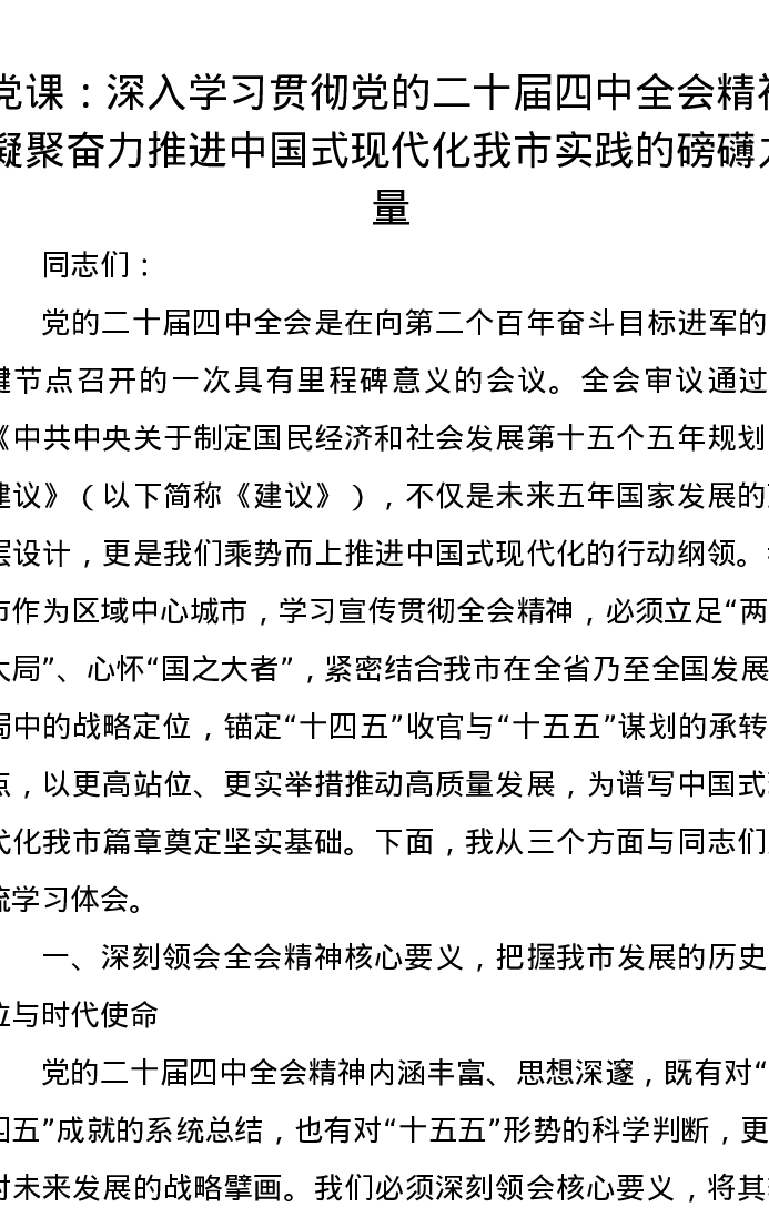 党课讲稿:深入学习贯彻党的二十届四中全会精神,凝聚奋力推进中国式现代化我市实践的磅礴力量