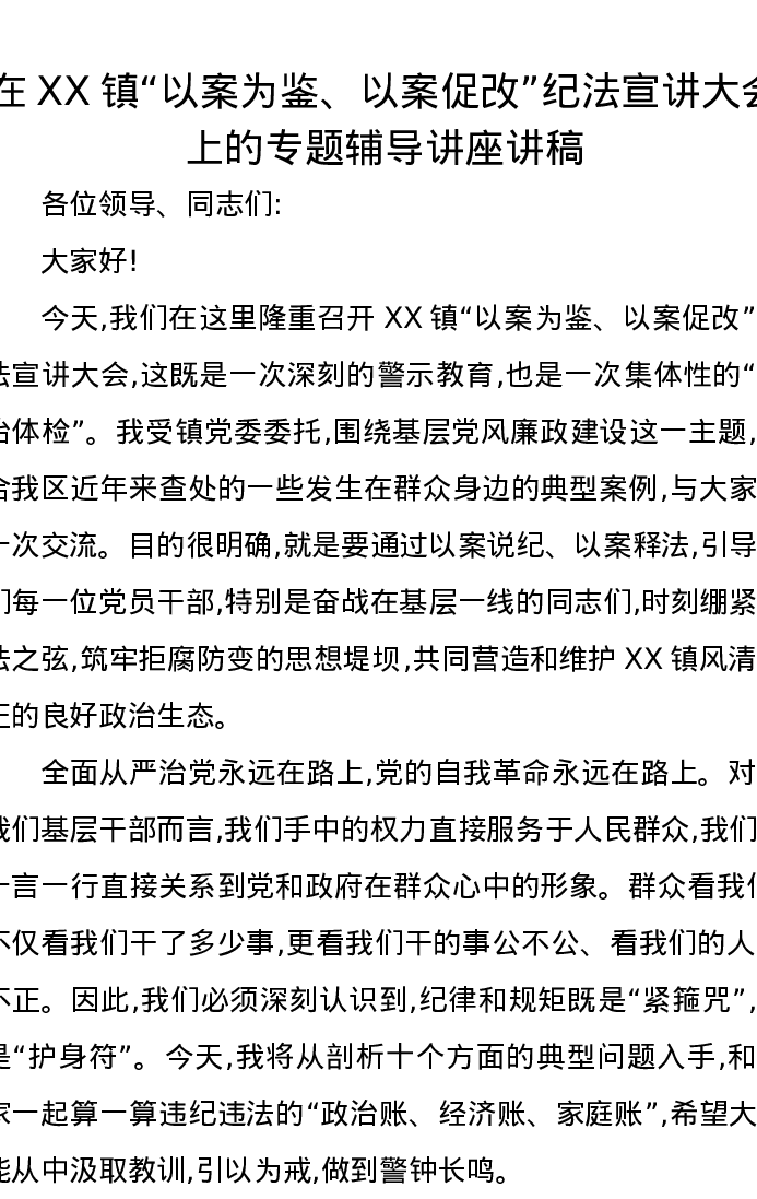 在XX镇“以案为鉴、以案促改”纪法宣讲大会上的专题辅导讲座讲稿