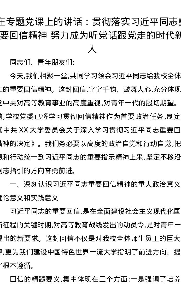 在专题党课上的讲话:贯彻落实习近平总书记重要回信精神 努力成为听党话跟党走的时代新人