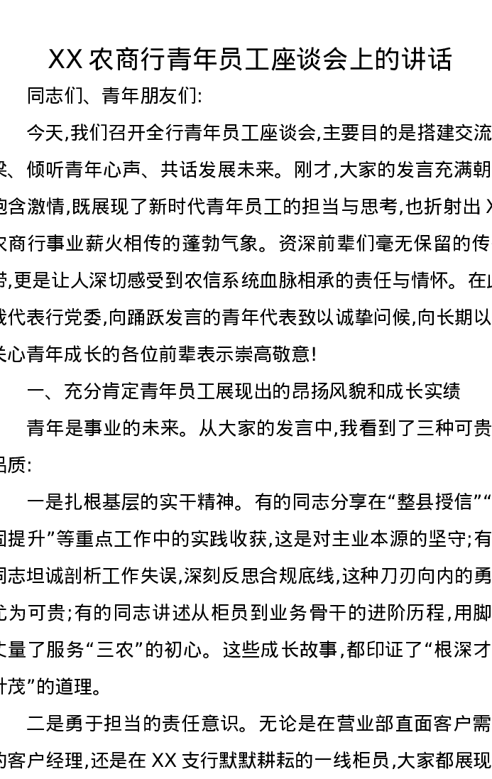 XX农商行青年员工座谈会上的讲话
