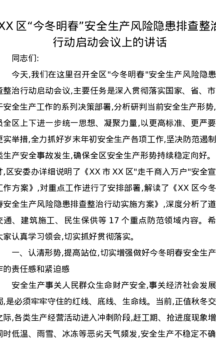XX区“今冬明春”安全生产风险隐患排查整治行动启动会议上的讲话