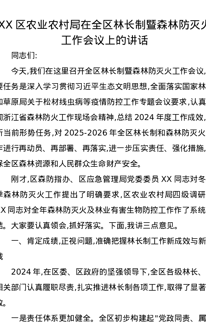XX区农业农村局在全区林长制暨森林防灭火工作会议上的讲话