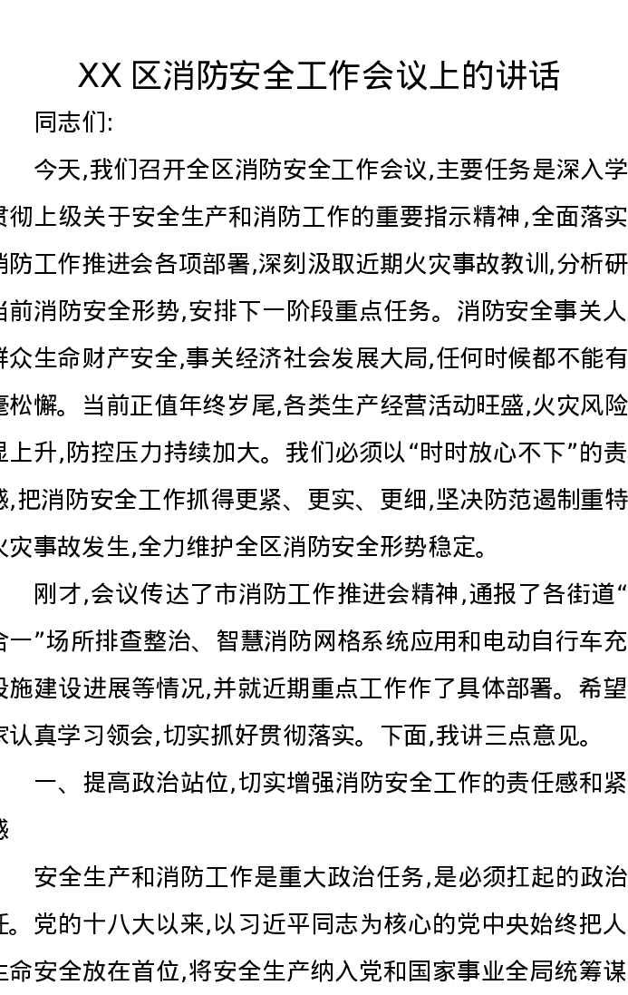 XX区消防安全工作会议上的讲话