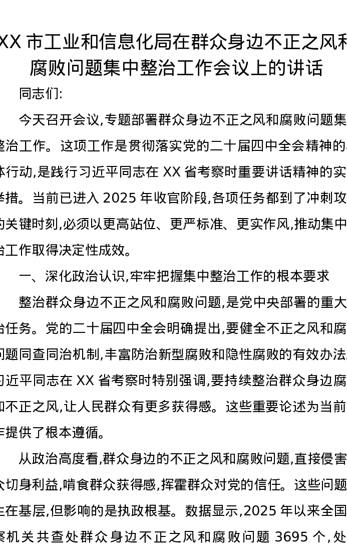 XX市工业和信息化局在群众身边不正之风和腐败问题集中整治工作会议上的讲话