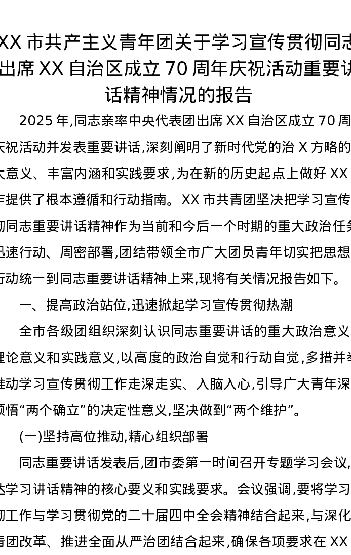 XX市共产主义青年团关于学习宣传贯彻总书记出席XX自治区成立70周年庆祝活动重要讲话精神情况的报告
