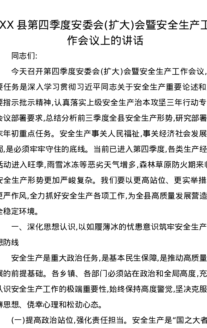XX县第四季度安委会(扩大)会暨安全生产工作会议上的讲话
