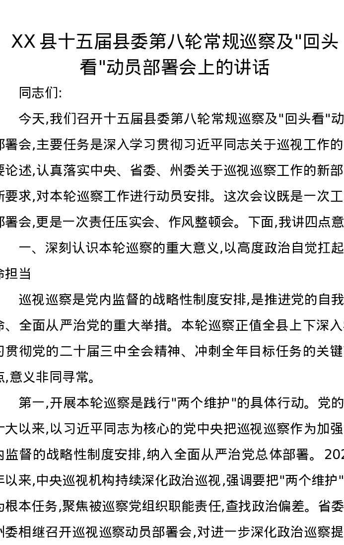 XX县十五届县委第八轮常规巡察及回头看动员部署会上的讲话