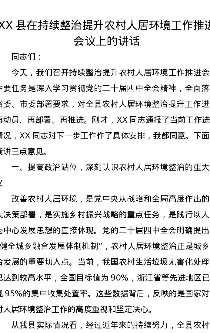 XX县在持续整治提升农村人居环境工作推进会议上的讲话