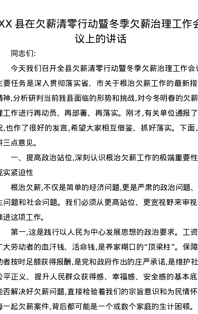 XX县在欠薪清零行动暨冬季欠薪治理工作会议上的讲话