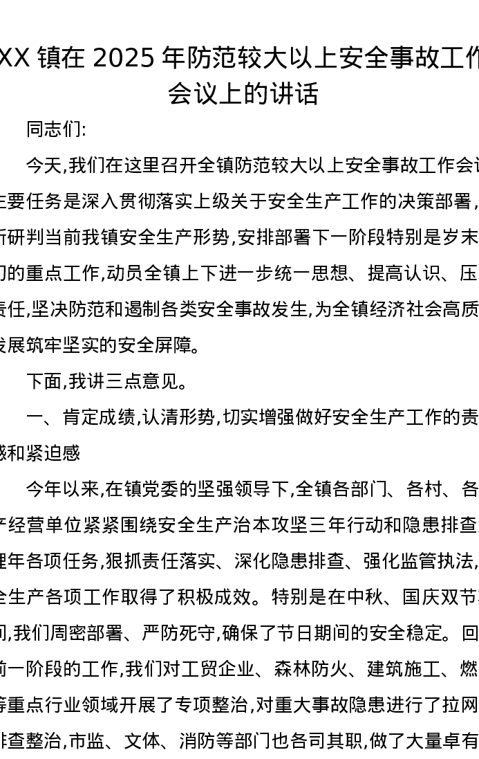 XX镇在2025年防范较大以上安全事故工作会议上的讲话