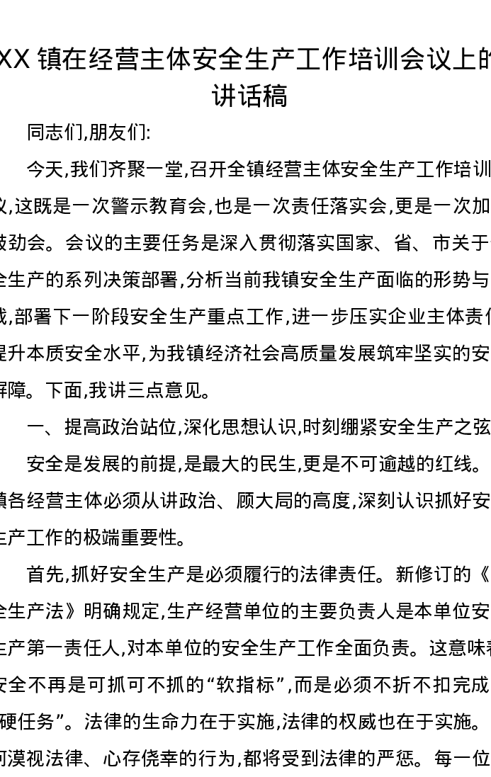 XX镇在经营主体安全生产工作培训会议上的讲话稿