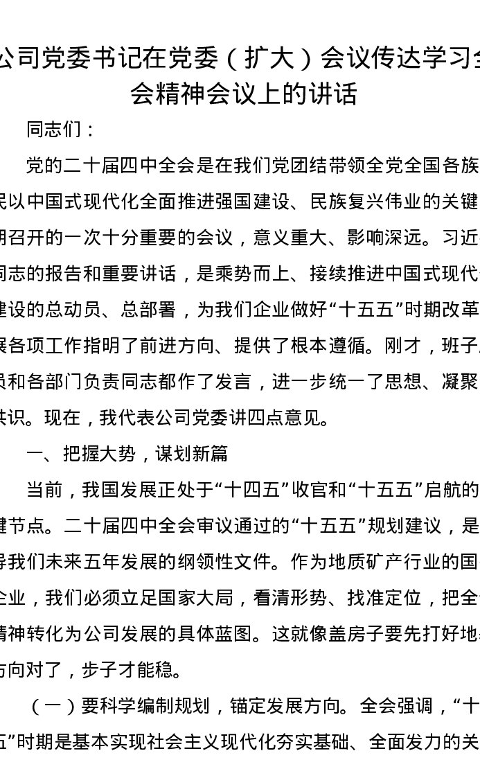 公司党委书记在党委(扩大)会议传达学习二十届四中全会精神会议上的讲话
